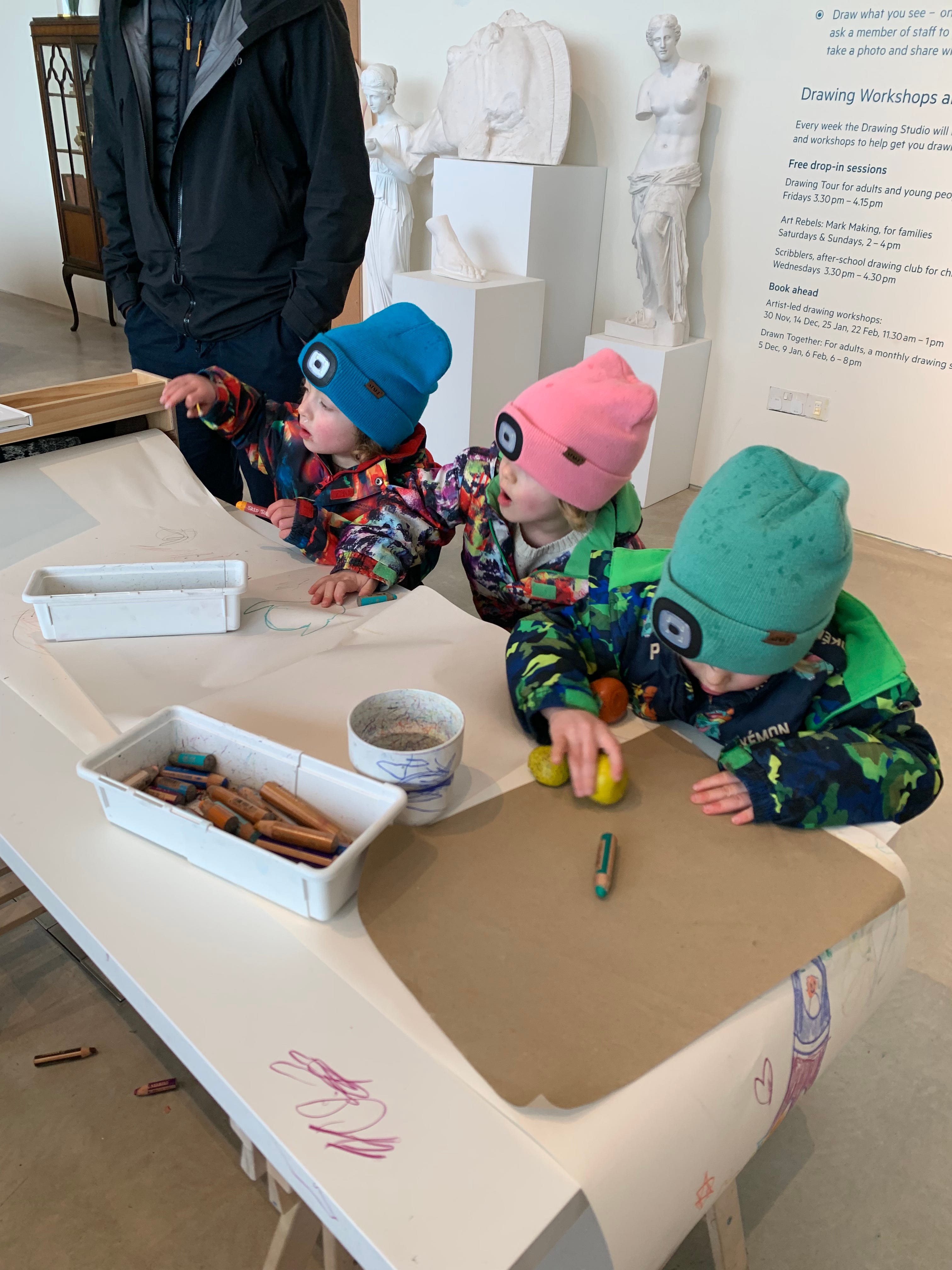 (Picture of the boys drawing at the Turner Contemporary prior to Pink-Plate-Gate)