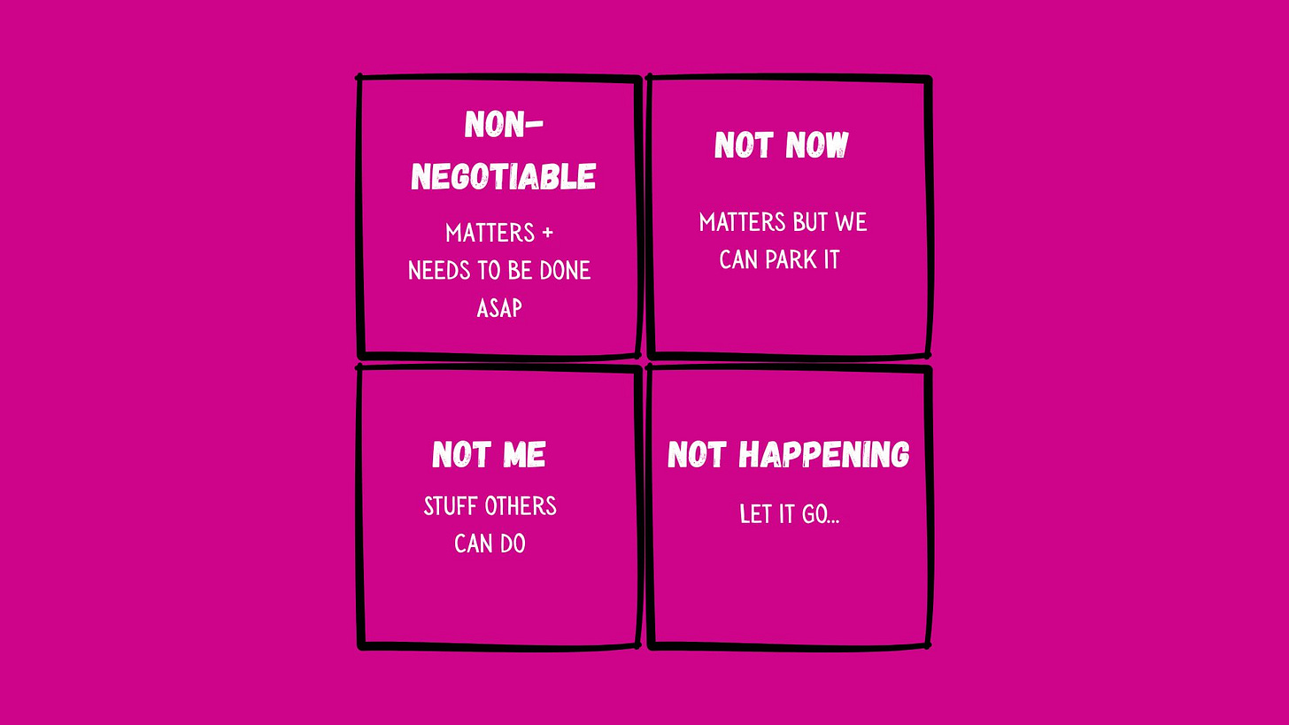 There’s no hierarchy, so everything on your list feels like it needs doing now. Or as I frequently yell at my triplets “RIGHT NOW!!!!”